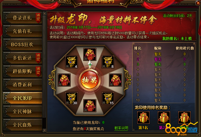 2、活动说明:活动期间,使用龙印碎片达到一定数量可以领取相应的奖励,使用碎片超过30000的可以参与龙印碎片排名奖励,活动零点结束。