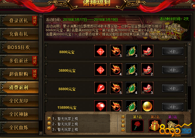 2、活动说明:累计消费对应额度可领取丰厚奖励,达到一定金额后可参与排行活动零点结束,排名奖励在活动结束后第二天通过邮件发放。