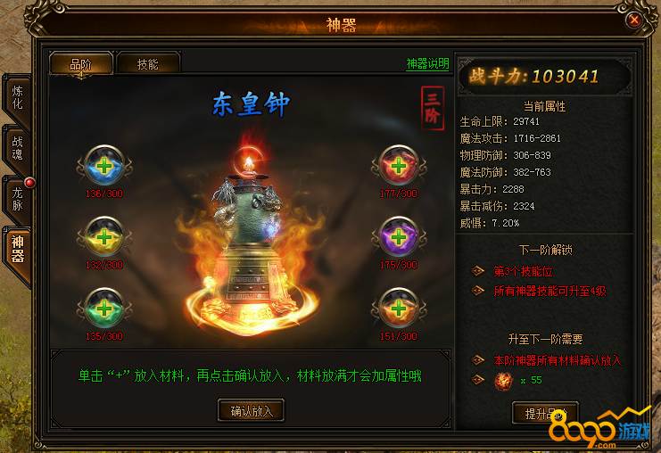 2) 在升阶部分,需放满6种不同材料后神器可提升品阶,为角色带来大量属性,更有稀有属性“威慑”