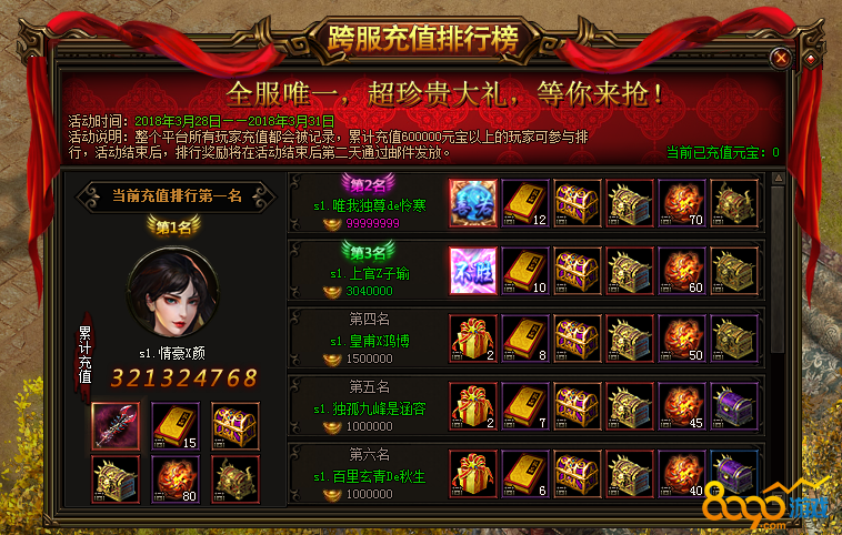 2、活动说明:活动期间,整个平台所有玩家充值都会被记录,累计充值600000元宝以上的玩家可参与排行,活动结束后,排行奖励将在活动结束后第二天通过邮件发放