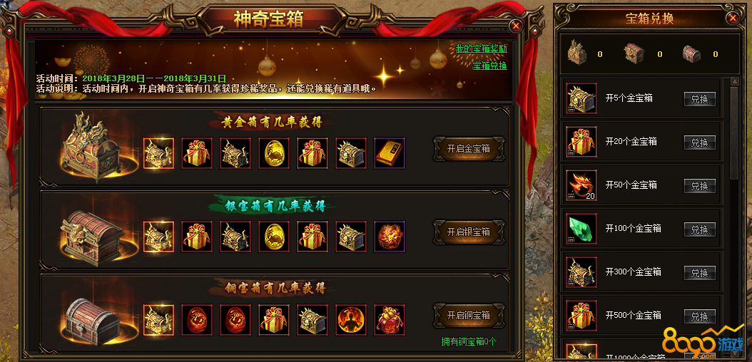 2、活动说明:活动期间,开启神器宝箱有几率获得珍稀奖品(武器随机宝箱,天地至尊极品宝箱,诸神极品宝箱,莲花灵子精魄等),还能兑换稀有道具