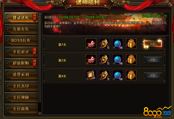 2、活动说明:活动期间,每日登陆可领取免费礼包一份,登陆越多礼包越丰厚哦。