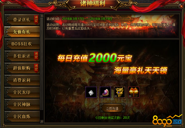 2、活动说明:活动期间每充值2000元宝可领取返利奖励,单日一共可领取20次,每日0点重置。请及时领取,以免充值后奖励丢失。