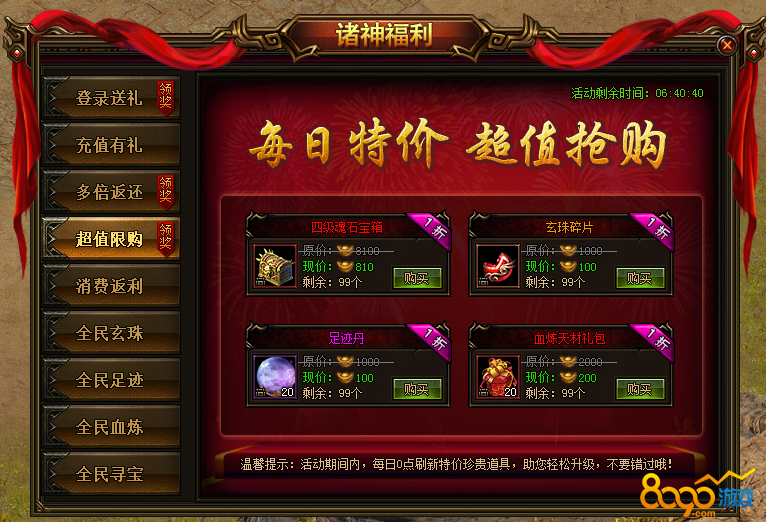 2、活动说明:活动期间内,每日0点刷新特价珍贵道具。