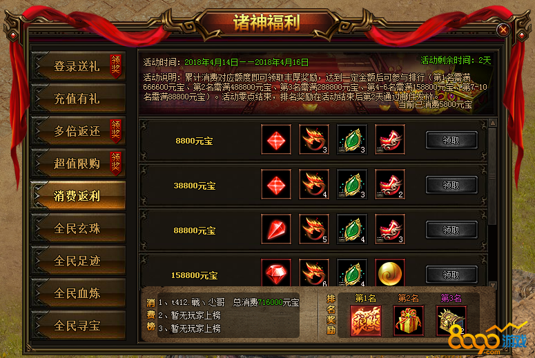 2、活动说明:累计消费对应额度可领取丰厚奖励,达到一定金额后可参与排行活动零点结束,排名奖励在活动结束后第二天通过邮件发放。