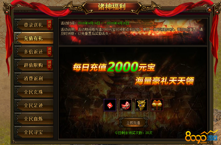 2、活动说明:活动期间每充值2000元宝可领取返利奖励,单日一共可领取20次,每日0点重置。请及时领取,以免充值后奖励丢失。