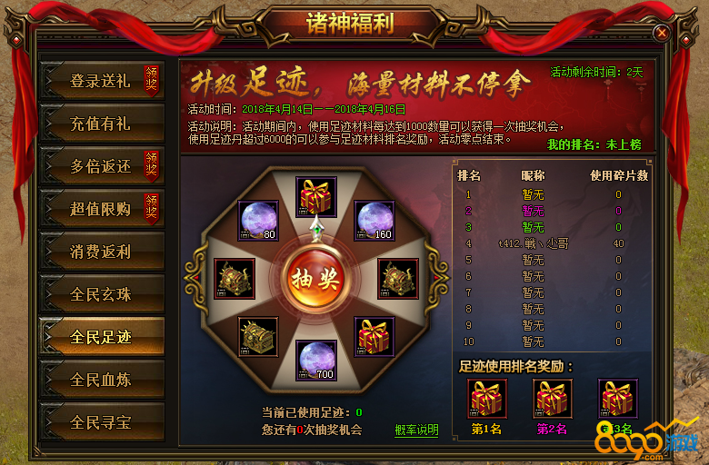 2、活动说明:活动期间,累积使用足迹丹以领取额外珍贵道具,达到一定额度还可以参与排行,排行奖励在活动结束第二天通过邮件发放。