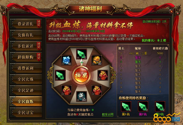 2、活动说明:活动期间,使用血炼材料达到一定数量可以领取相应的奖励,使用碎片超过5000的可以参与血炼排名奖励,活动零点结束。