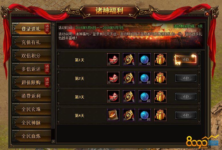 2、活动说明:活动期间,每日登陆可领取免费礼包一份,登陆越多礼包越丰厚哦。