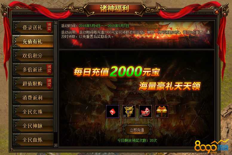 2、活动说明:活动期间每充值2000元宝可领取返利奖励,单日一共可领取20次,每日0点重置。请及时领取,以免充值后奖励丢失。