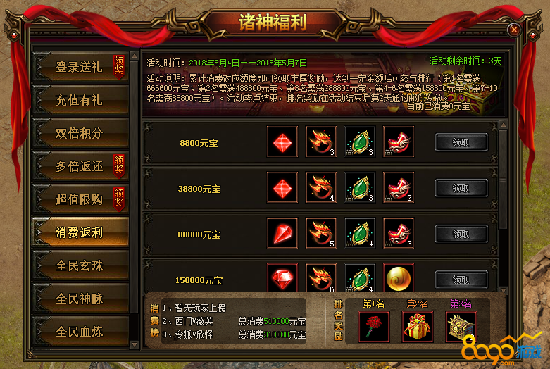 2、活动说明:累计消费对应额度可领取丰厚奖励,达到一定金额后可参与排行活动零点结束,排名奖励在活动结束后第二天通过邮件发放。