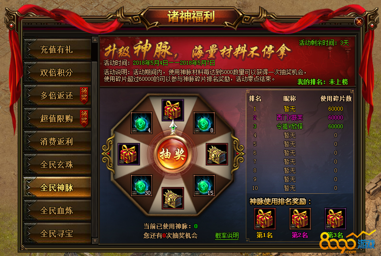 2、活动说明:活动期间,累积使用神脉精华以领取额外珍贵道具,达到一定额度还可以参与排行,排行奖励在活动结束第二天通过邮件发放。