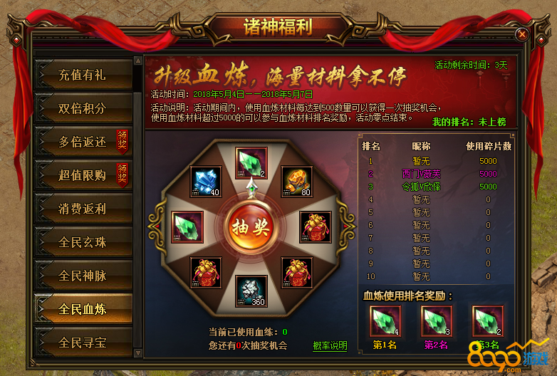 2、活动说明:活动期间,使用血炼材料达到一定数量可以领取相应的奖励,使用碎片超过5000的可以参与血炼排名奖励,活动零点结束。