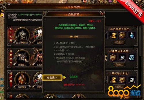 在这神秘的血色宫殿中一共盘踞着11只超级Boss,他们集合在这里,等待勇士们的挑战,玩家若能战战告捷,必能一鸣惊人,扬名天下。在此期间,副本的刷新时间为3-60分钟,要注意把握时间。击杀Boss后的奖励也是十分诱人的,各种珍稀的材料,全系列的装备等都有可能获得。勇士们要努力战斗啊!