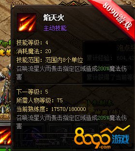 8090天地诸神的焰天火技能是属于冥法的专属神技,直接召唤流星火雨轰击指定区域造成很高的魔法伤害,属于冥法的终极伤害技能,尤其PK的时候完全无视施法距离,直接远距离轰炸,属于一个非常强力的输出技能。另外技能等级越高,造成的伤害也就越多,不管打怪或者PK都非常强力。