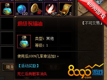 在8090天地诸神中想要增加幸运就需要用的超级祝福油,超级祝福油比祝福油多了超级这2个字就意味着功效更佳强大,超级祝福油使用后100%几率幸运加1,不像普通祝福油还有失败的可能,超油直接可以使武器幸运+1。