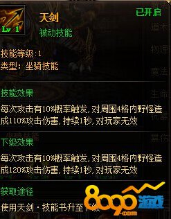 其中的天剑就是一个非常不错的技能,每次攻击有几率触发对周围野怪造成百分比的攻击伤害,攻击值为自身攻击,对玩家无效,对于战士来说简直是神技,战士职业本身的群攻技能少范围小,有了这个技能刷怪效率快很多。