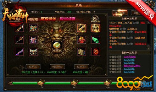 通过龙珠兑换系统可以获得超高级装备、各种极品战宠,还有以百万计的经验值,例如青云伏魔战盔、玄荒战刀等等。龙珠可以通过元宝进行购买,200元宝可以获得龙珠令一枚,而十个龙珠令则打9.5折,只要1900元宝即可活动。
