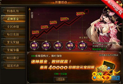 开服第一天,在开服活动中新增了一个诸神基金,需要完成首充后才能购买。活动期间内达到相对应的转生等级,即可领取多倍元宝。注意是元宝,不是绑元,不算在VIP充值经验中。目前可投资元宝数量为1000。