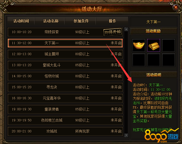 其实这个天地诸神天下第一活动的玩法很简单,就是最后谁留在里面,谁就是最后的赢家,就能得到天下第一的名号。第一名可以获得大量元宝,其他参与的玩家可以得到大量金币奖励。所以大家有时间的话,一定要参加这个活动哦。