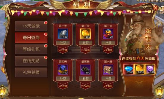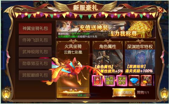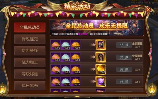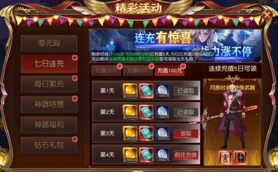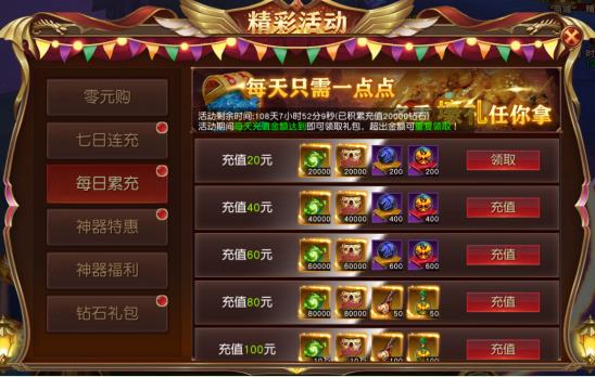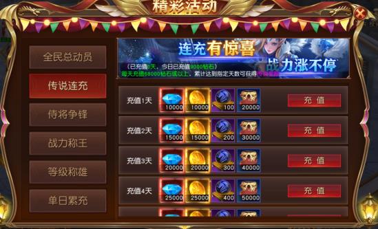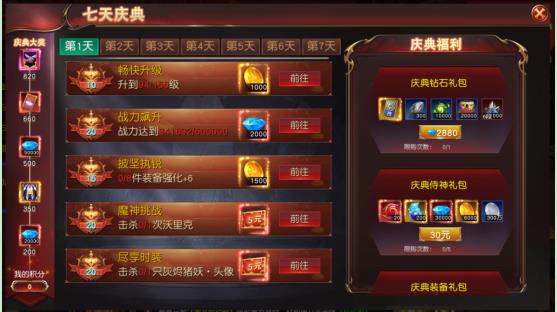 新服开服7天连续完成任务获得积分,累计积分领取大奖,以及附带每日直购礼包和元宝礼包的活动。