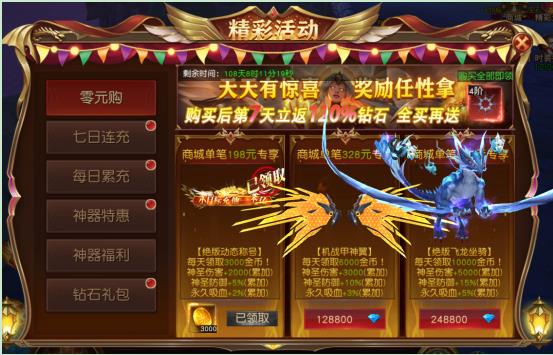 结合神器特惠活动的内容,根据玩家购买神器特惠礼包的次数,获得额外返利奖励。