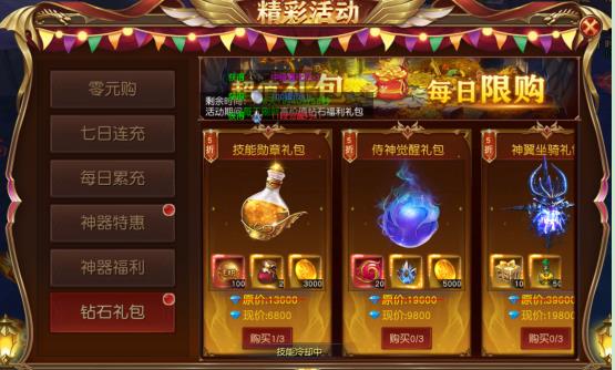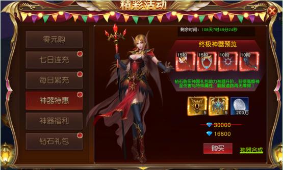 玩家通过消耗钻石可以不断重复购买神器碎片,从而激活神器以及给神器不断升阶。