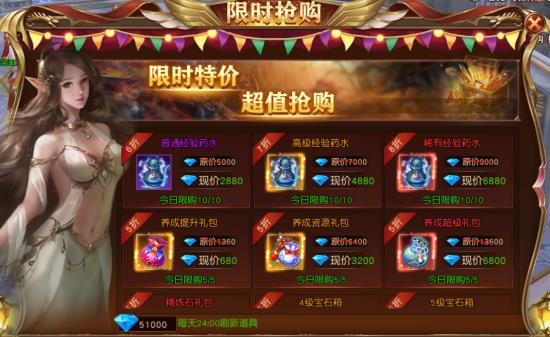 活动期间每天提供多组礼包用于玩家消耗钻石购买,包含各个系统的日常消耗养成资源。