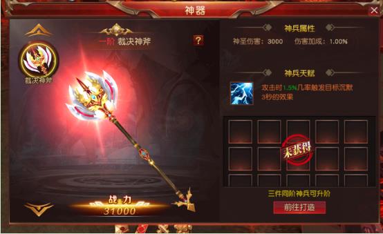 游戏中玩家可以通过完成魔神挑战获得神器碎片,凑齐足够的碎片后就可以打造专属的神兵和神器,并装备在专属部位上。