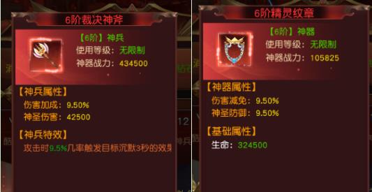 神兵主要提升角色大量神圣伤害和伤害加成,神器主要提升大量的神圣抵抗和伤害减免。当角色参与战斗时,神圣伤害和神圣抵抗属性将对胜负产生非常直接的影响,拥有越高品阶的神器,在战斗中才会拥有更多的优势。