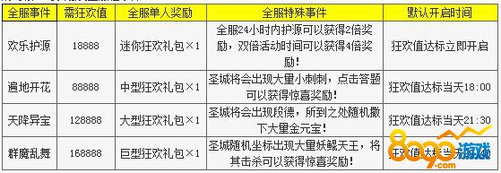 1、触发全服狂欢事件,会默认一个时间开启全服特殊事件;如果全部狂欢事件都被触发,在全部事件完成后会重置事件状态;