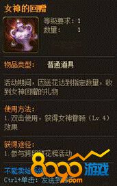 4、活动期间,每日累计赠送3000朵玫瑰花,即可领取女神的回赠Lv4(使用后24小时内增加300攻击),五级灵气丹×20;