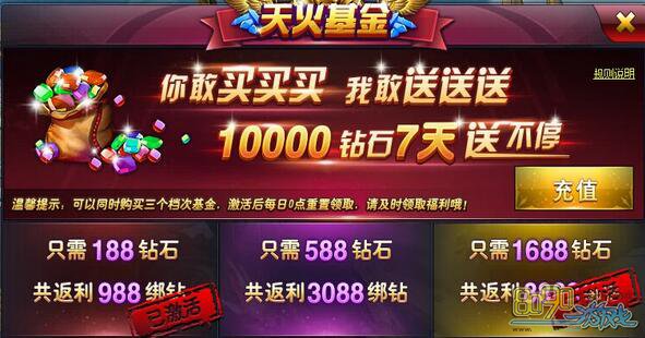 天火基金投资188钻石,共返利获取988绑钻及若干初级侍者丹,投资588钻石,共返利3088绑钻及若干D级守护宝石,投资1688钻石,共返利8888绑钻及初级坐骑结晶。您可以同时购买三个档次基金,激活后每日0点重置领取,并不累存,请及时领取福利哦!