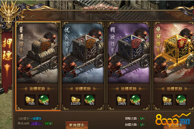 打劫他人镖车,根据不同等级镖车掉落不同数量元宝。