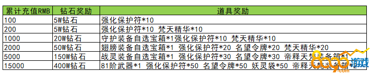 活动规则:累计充值满足条件可以领取对应的元宝与道具奖励