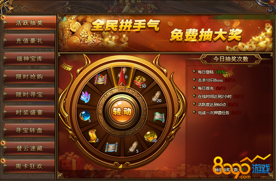 活动内容:累计寻宝可免费获得抽奖次数,累计寻宝3000次可获得全部八种奖励!