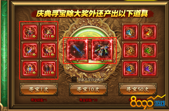 搜索"8090网页游戏"亲爱的战神玩家,大家好,庆典寻宝中加入了12阶核心元素,111阶首饰,109阶武器衣服,法相系统的专属装备;寻宝转盘中有天神印一阶加入哦;下面就来看一下具体的庆典内容吧。