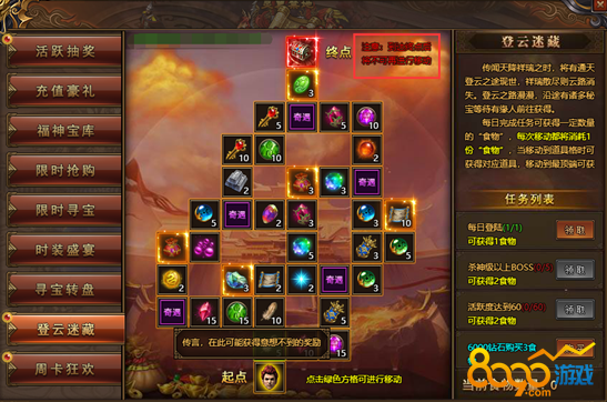 活动内容:每日登录,击杀BOSS(神级以上),活跃度达到60,可免费获得食物,免费得大奖!