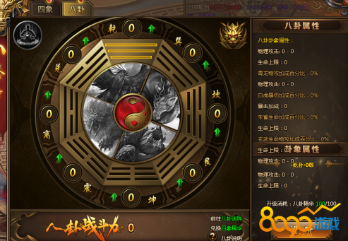 3. 提升八卦等级会提升角色属性,提升四象神力将百分比提升四象系统对角色的属性加成;