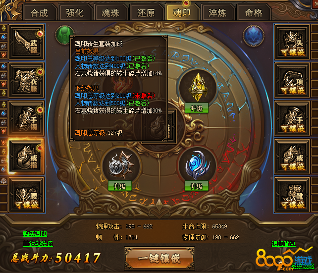 2.魂印转生套装需要花费钻石激活,激活后可大量提升石墓烧猪获得的转生碎片数量;