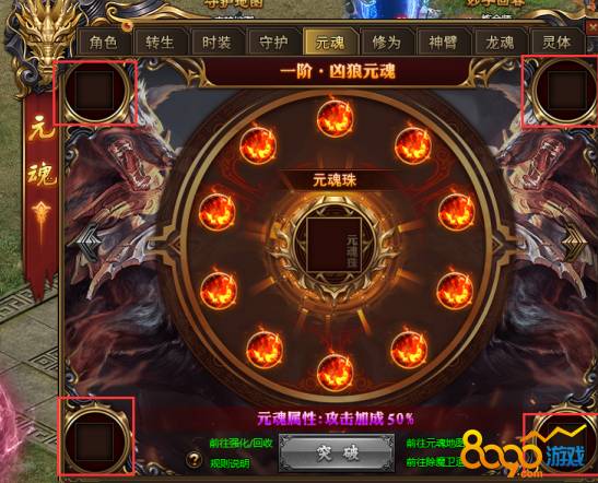 每一页四件魂玉都强化到指定等级还可获得对应元魂珠属性的百分比加成;