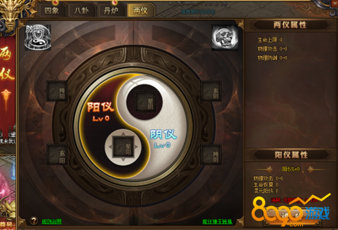 四象总等级达到300级,并且该服开服天数在25天以上的玩家可开启两仪系统;