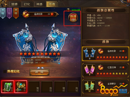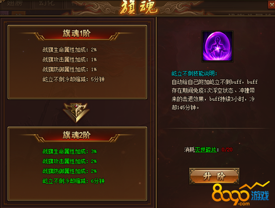 旗魂升阶可以百分比提升战旗属性,仅包括生命、攻击和防御,还能缩减【屹立不倒】的冷却时间;