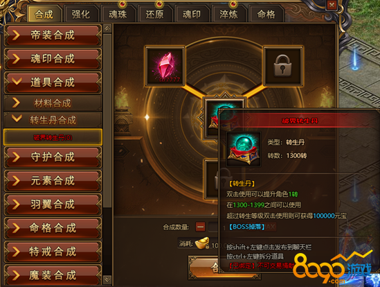 玩家转生上限扩到1400,可消耗7777转生碎片合成“破界转生丹”进行1300转以后的转生;