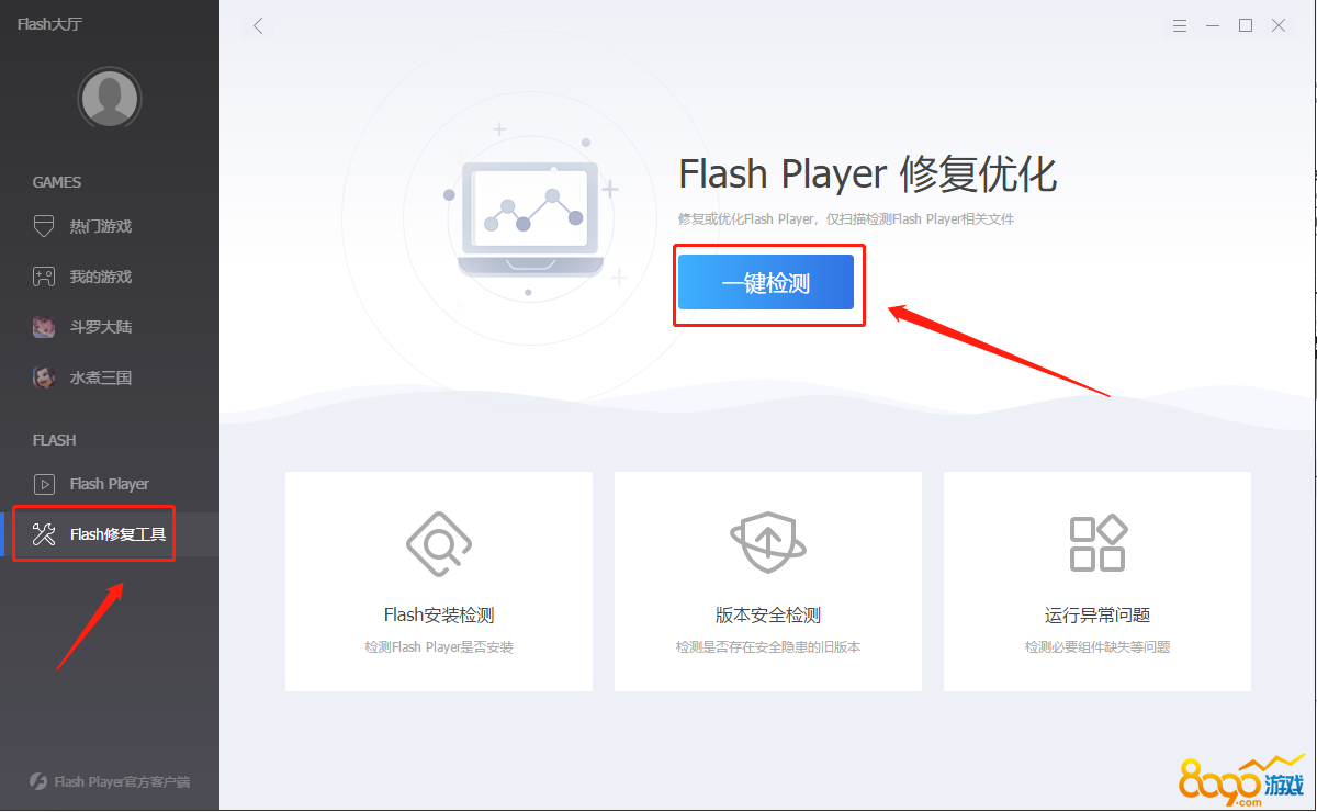 安装完成后打开,点击Flash修复工具右侧“一键检测”