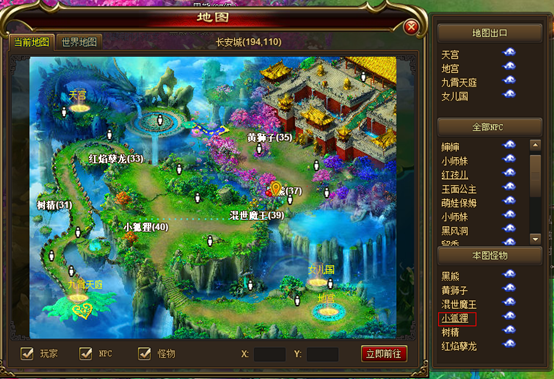 2.小地图界面的右边会有当前地图的NPC、怪物、传送点名称,点击之后就可以头顶“自动寻路中…”的文字,并自行走到目标处。