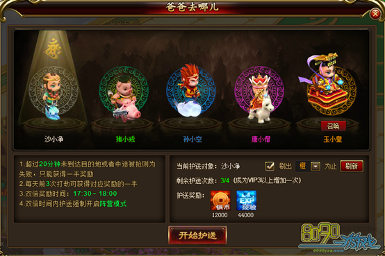 30级以上的玩家每天可到九霄天庭的NPC爸爸去哪儿处接取3次护送萌娃。每天17:30-18:00为双倍时间,右上方活动栏中出现“护送”标志,护送可以获得双倍奖励!
