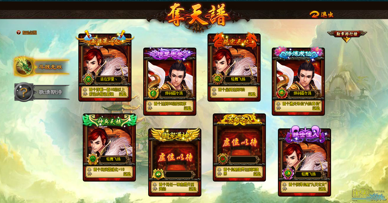 【活动内容】玩家按照相关活动规则,第一位达成相应活动条件的玩家可以获得专属的绚丽称号及丰厚的奖励