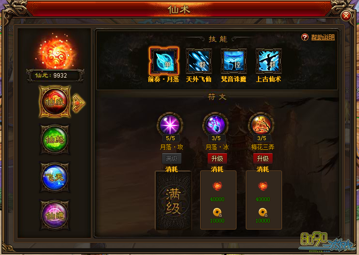 仙术技能随着等级自动开启,视技能类型划分为能量与怒气技能,消耗亦格子对应。而且只有激活所有的符文才会发挥最大的威力,符文可通过主线副本级荣誉兑换获取。符文升级余姚消耗仙元,每日天榜任务可以获得大量的仙元。