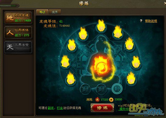 3.龙魂升级需消耗龙魂值,玩家可通过参与副本,在线打坐,完成每日循环任务以及与玩家交易龙魂丹获得。